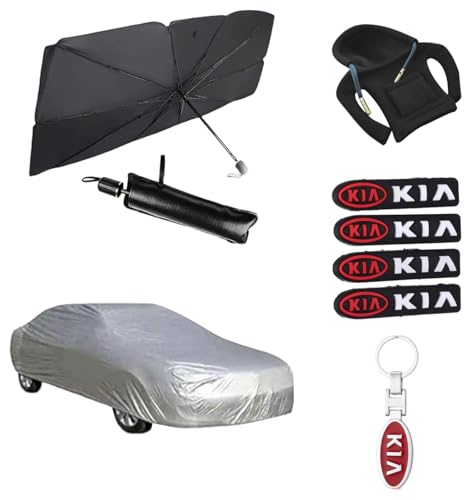 مجموعة مستلزمات السيارات من اوتو ام واي كيه، تتضمن جراب غطاء مقاوم للماء + مظلة شمسية لزجاج مقدمة السيارة + سلسلة مفاتيح تحمل العلامة التجارية + هودي ترس بالوان متنوعة + سدادة باب + شنطة بحبل
