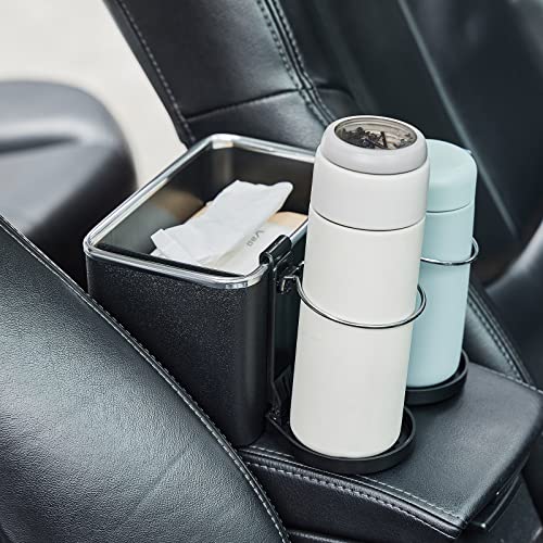 صندوق تخزين مسند ذراع السيارة لتخزين المناديل مع حاملين أكواب قابلين للطي، منظم جانبي لوحدة التحكم في السيارة لكوب الماء والمناديل الورقية والموبايلات (مقاس واحد، أسود)