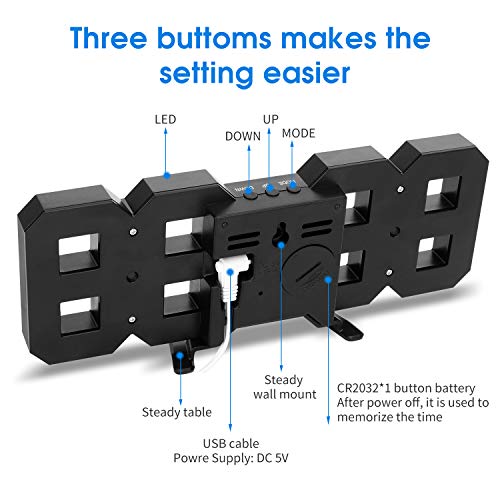- ساعة حائط LED --: مع رقم كبير LED ثلاثي الأبعاد، يمكنك قراءة الوقت الحقيقي على بعد مسافة طويلة. مع 54 خرزة إضاءة LED. يمكن الرؤية عن بعد، بدون ضوء أزرق. تتميز ساعة المنبه هذه بتوقيت 12/24 ساعة.