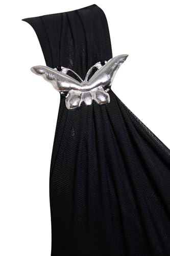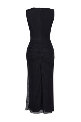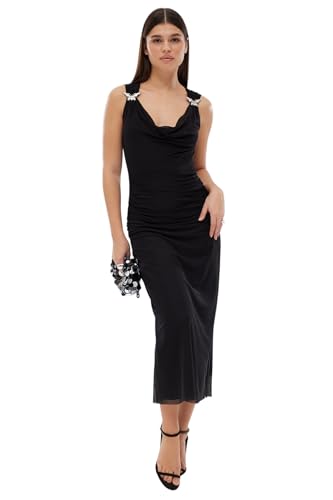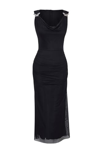ترنديول فستان انيق محبوك من التول المبطن بقبة متدلية للنساء، لون اسود، موديل TPRSS25EL00042