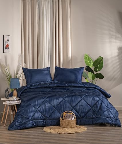 لحاف وأكياس مخدات بتصميم مقلم من دهب لاكجري هوم، طقم من 3 قطع، المقاس 2.4 م × 2.2 م، أزرق كحلي