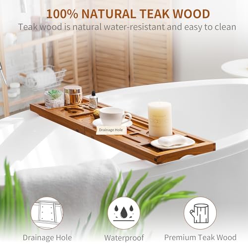 صينية حوض استحمام من خشب الساج، علبة حوض استحمام قابلة للطي، اكسسوارات حوض الاستحمام بمقابض قابلة للتوسيع وحامل موبايل زجاجي وحامل كتب للمنزل والمنتجعات الصحية والاسترخاء والقراءة من اكسمان