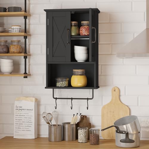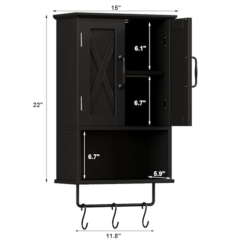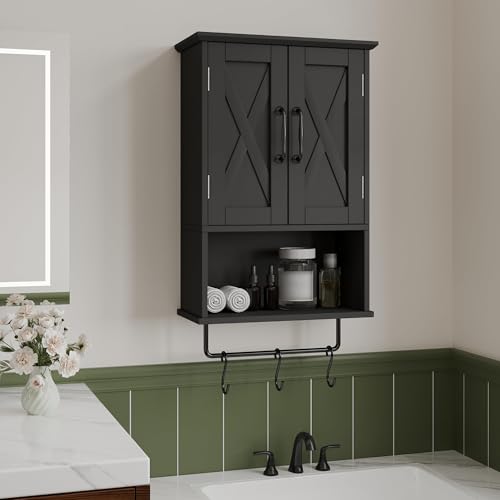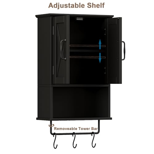 خزانة أدوية بتصميم بيت المزرعة، خزانة حائط للحمام مع رف قابل للتعديل، قضيب فوط، 3 خطافات، خزانة تخزين فوق المرحاض للحمام والمطبخ، لون أسود من تشو تشو