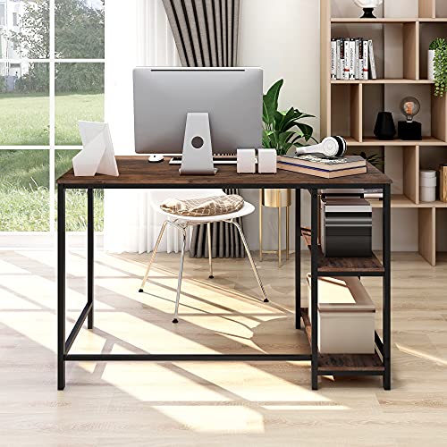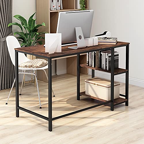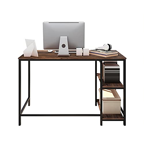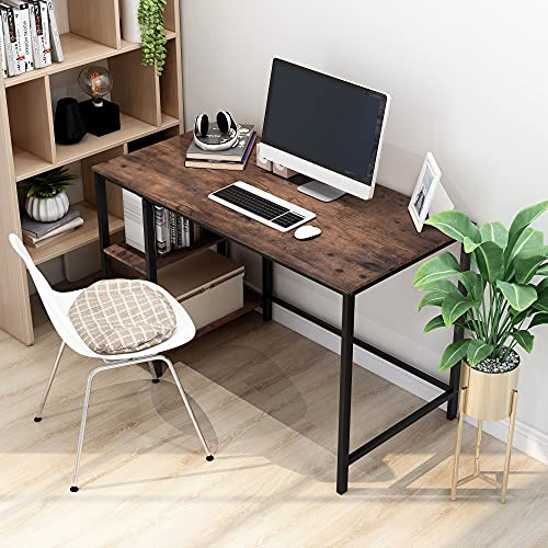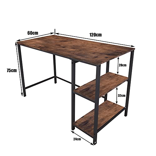 FOUBAM - مكتب كمبيوتر ريفي ، طاولة مكتب منزلية مع خشب صلب وإطار معدني شديد التحمل كمكتب دراسة ، أسود + بني