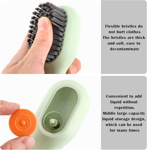 - Press to disperse cleanser: you can press the button once to flow the cleaning liquid that the brush head can store with a certain capacity inside, put the cap and press it until it flows automatically and press back to stop the wash detergent flow. This brush can control the amount of laundry detergent to avoid wasting and the problem of not finding detergent.