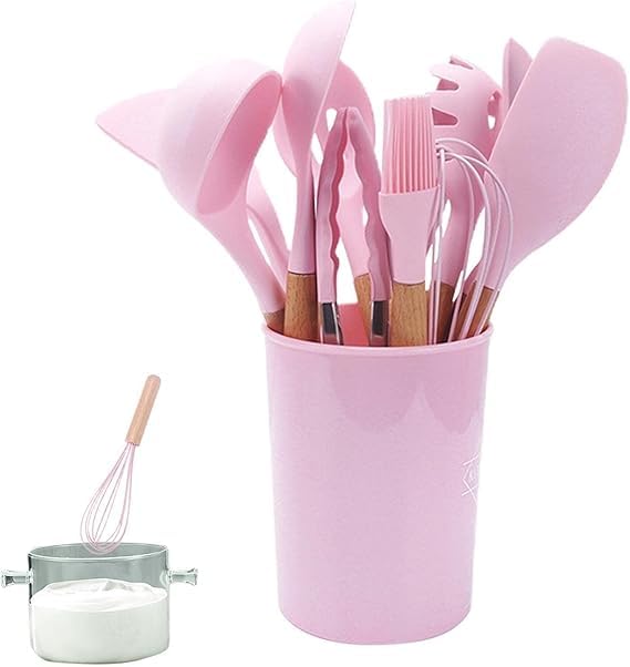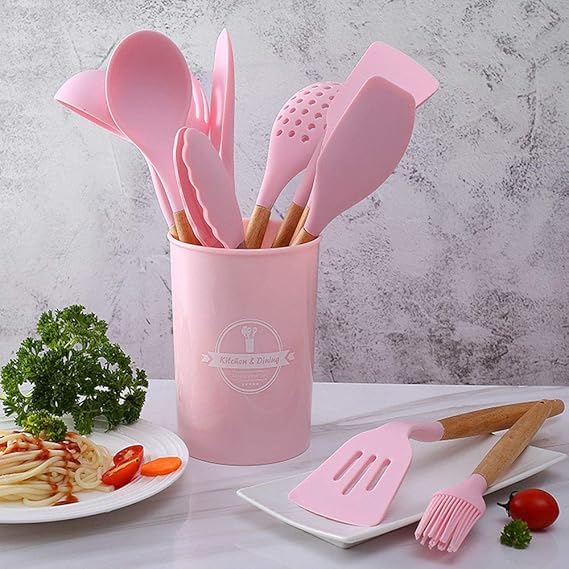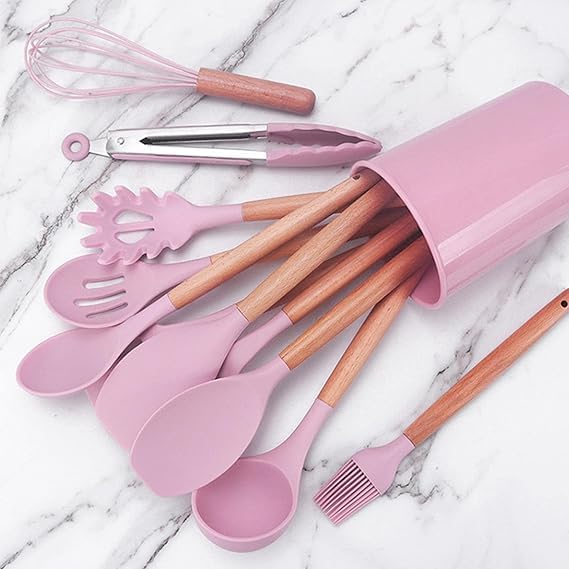 - DESIGNED FOR FAMILIES: Comes with 12 pcs of silicone to meet the essential needs of the kitchen, It is versatile and features a must have without frequency contains: chesel shovel, shovel, scoop, putter, hanging soup , hanging, spatula, food grip, strain, secret hanging, spaghetti scoop, oil brush, storage girdle comes in a new upgraded version: all silicone and is heat resistant up to 446 degrees Fahrenheit will not worry about its Burn when cooking with wood hand: it comes with a wooden handle to absorb UV and reverse infrared rays Comes with Low Noise for Smooth Freshness Use Perfect Gift: Great gift for moms, family and friends for mother's day, thanksgiving, christmas, party, etc