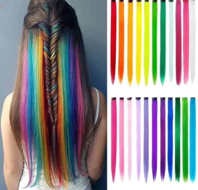 • 12 قطعة من وصلات الشعر المتدرجة بمشبك في وصلات شعر بالوان قوس قزح بلون زهري واحمر ورمادي وازرق