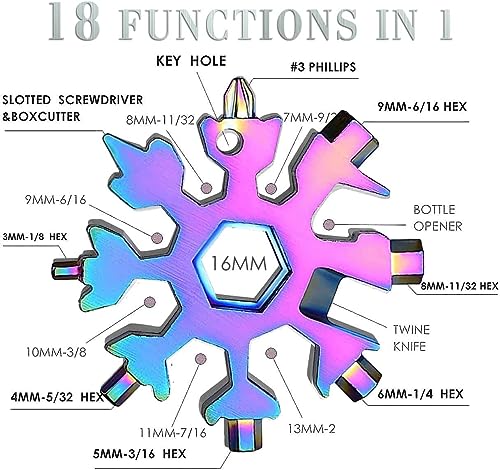 - 18 وظيفة في 1: بفضل تصميمها الفريد على شكل ندفة الثلج، تتميز هذه الأداة بـ 18 وظيفة مختلفة بما في ذلك المفكات والمفاتيح وفتاحة الزجاجات والمزيد.