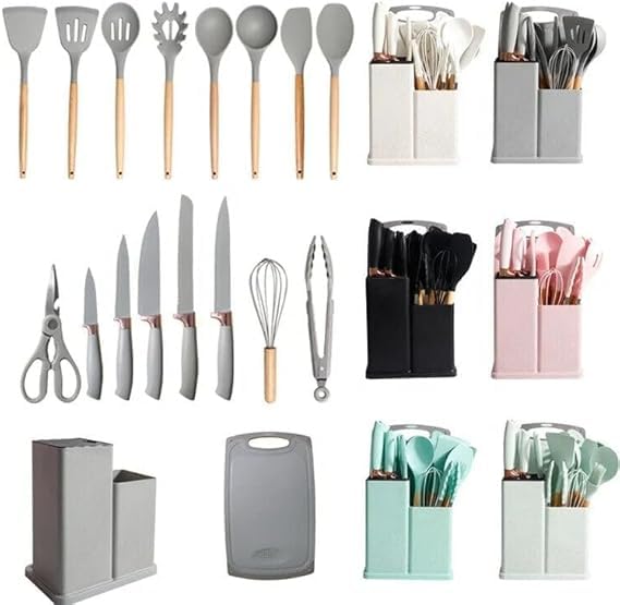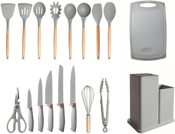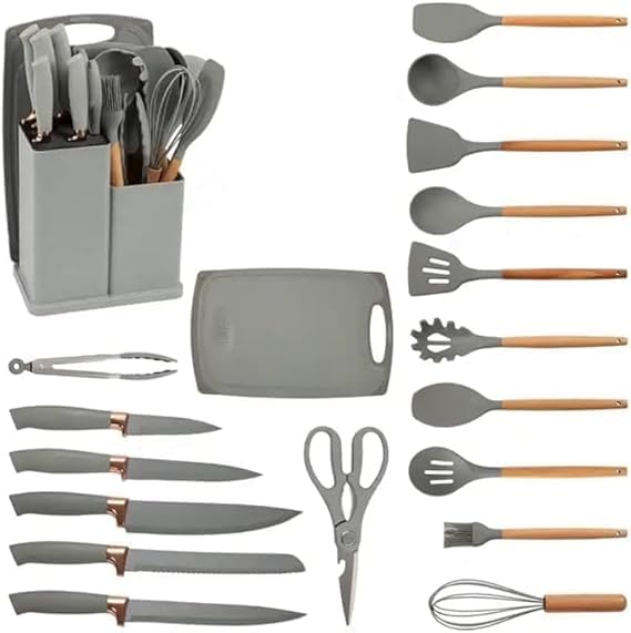 - All-inclusive 19 piece cooking tool set Includes 11 multi-use silicone cooking tools Heat resistant and safe to use with all cooking utensils Ergonomic handles for a comfortable grip. 5 sharp knives made of premium stainless steel Chef Knife, Baking Knife, Versatile Knife, Exfoliating Knife, Sculpting Knife Includes a durable cutting board