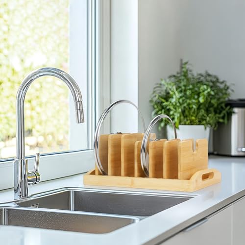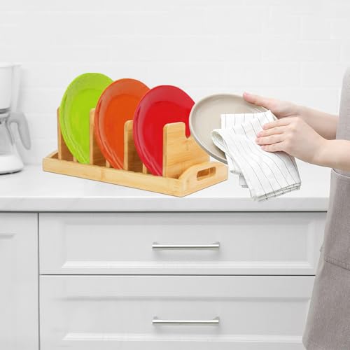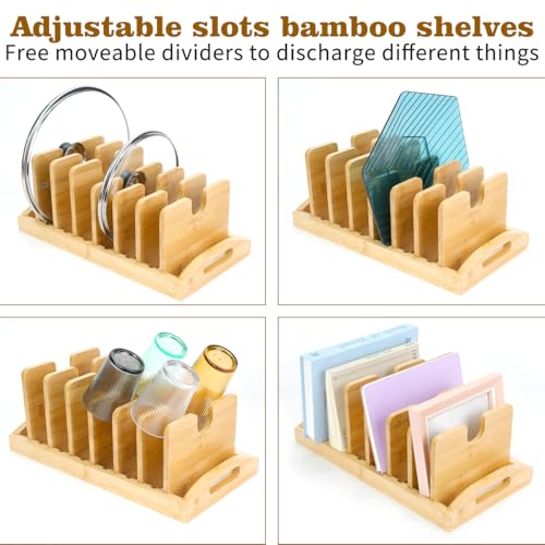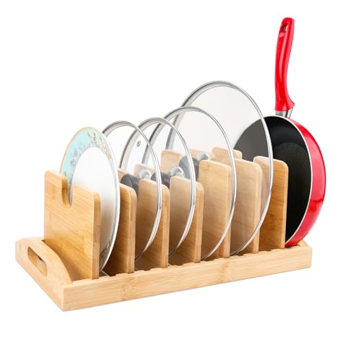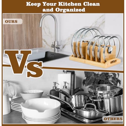 - Durable and Naturally Beautiful: Our pot lid holders are made of 100% premium solid bamboo. Unique texture, bright color, not easy to crack. The surface is varnished for longer use, ideal for storing a variety of cookware such as skillets, pans and plates.