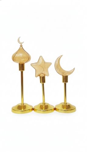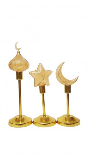 Generic - طقم 3 مصباح طاولة رمضاني خمات عاليه الجوده مزخرف على شكل نجمة وقمر، يعمل بالبطارية، مزود بإضاءة LED دافئة على شكل هلال، مثالي لتزيين المنزل وغرفة النوم. بلون دهبى