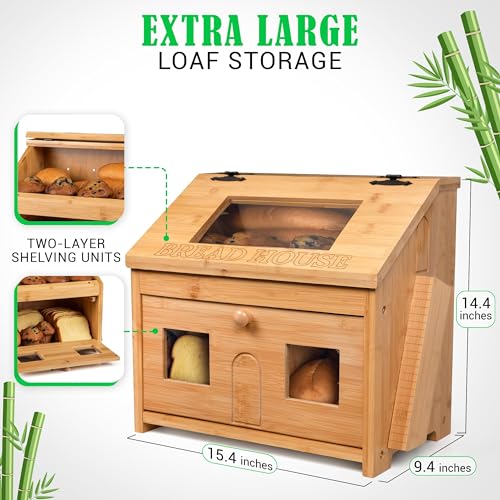 3J2 Discoveries - Bread Box for Kitchen Countertop – Large Wooden Bamboo Bread Box with Cutting Board (SELF-ASSEMBLY)