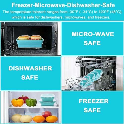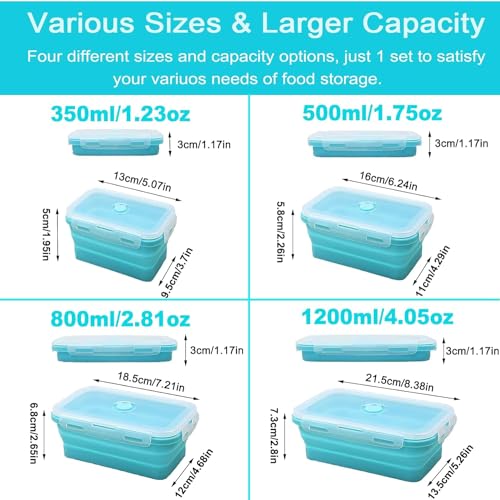 - 🍇【 𝗩𝗮𝗿𝗶𝗼𝘂𝘀 𝗦𝗶𝘇𝗲𝘀 𝗖𝗼𝗹𝗼𝗿𝘀 & 𝗟𝗮𝗿𝗴𝗲𝗿 𝗖𝗮𝗽𝗮𝗰𝗮𝗶𝘁𝘆 】: Flat stacks collapsible storage containers sets of 8 - 4 Rectangle and 4 round, each has 4 different capacities (about 12 oz/ 350 ml, 17 oz/ 500 ml, 27 oz/ 800 ml, 41 oz/ 1200 ml) and 3 colors (blue,pink,green). Various sizes can better suit your demands of food storage in various condition; For instance, freezer containers, lunch containers, leftover salad pizza containers, rv kitchen camper accessories, etc.