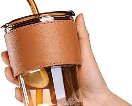 Generic - كوب زجاجي للمشروبات مع غطاء وقش قابل لإعادة الاستخدام، تصميم عصري بني، مناسب للشاي والقهوة والحليب والعسل، مع حامل جلد، ٤٥٠ مل