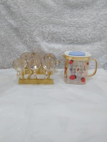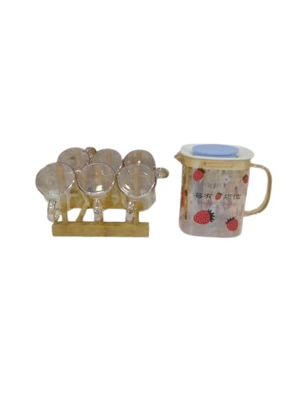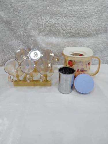Generic - كوب حراري بمصفاه داخليه ، لون عسل شفاف برسومات لطيف شكل فرلة ، مع 6 أكواب شفاف برسومات فراولة حجم صغير مناسب للقهوة أو الشاي على حامل خشبي للأكواب ، سعة 500 مل