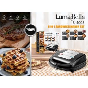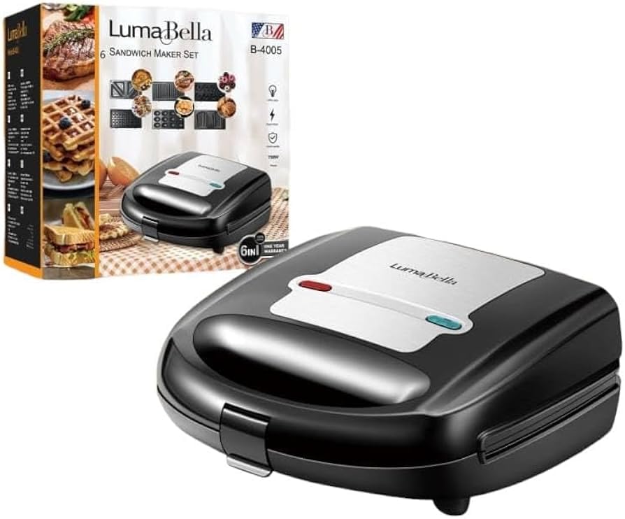 Generic - توستر شواية 750 وات ساندوتش ميكر/ 6*1/ أشكال مخبوزات مختلفة :دونات ، بانينى ، جريل،كعك،توست،وافل/سخان علوى و سفلى / لمبة بيان / تخزين رأسى / من لومابيلا