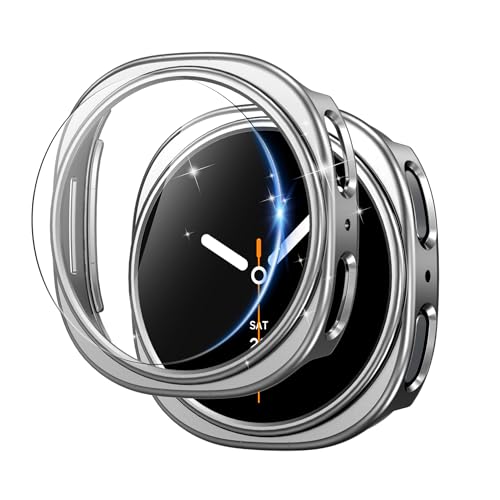 ACEQINGSE - 2 + 2 Pieces Case for Samsung Galaxy Watch 8 44 mm with Screen Protector, Ultra Thin HD Tempered Glass Screen Protector + PC Protective Case for Galaxy Watch 8 44 mm (Silver)