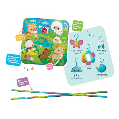 - Product information Soft detachable arches Activity elements: A tactile fur insert A rustling peek-a-boo element Satin ribbons A textured string Hanging toys: A soft safe mirror A soft butterfly with rustling wings A soft bird with a squeaker inside A soft cloud-rattle A teether with a convenient handle Batteries: Not required