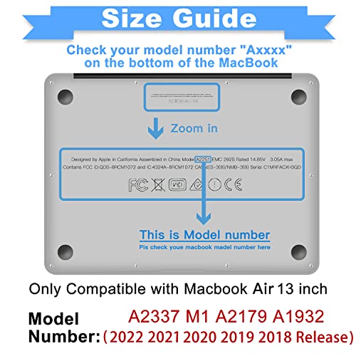 - 【الموديل المتوافق】متوافق فقط مع ماك بوك اير 13 بوصة (الموديلات: M1 A2337 A2179 A1932) إصدار 2022 2021 2020 2019 2018 مع شريحة M1 وشاشة ريتينا وخاصية التعرف باللمس. يُرجى التحقق مرة أخرى من رقم طراز اللاب توب الخاص بك "Axxxx" في الجزء السفلي من اللاب توب لتحديد التوافق.