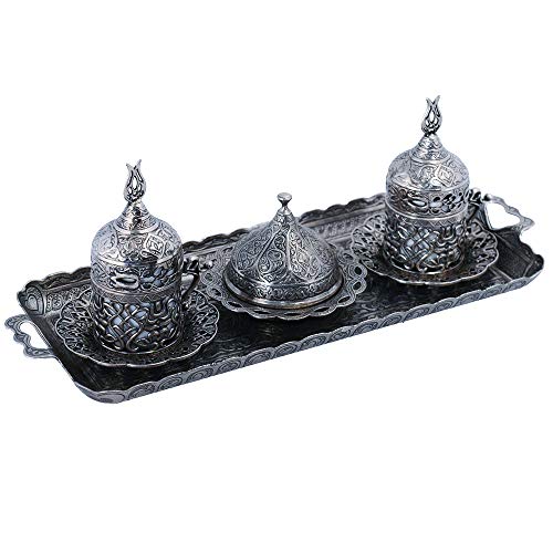 - مجموعة كاملة: تتضمن كوبين قهوة ووعاء سكر وصينية تقديم، مثالية لتقديم القهوة التركية التقليدية.