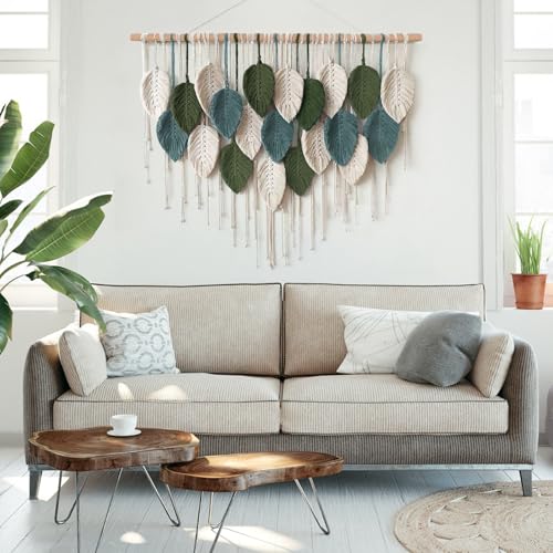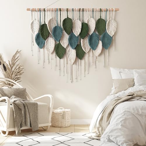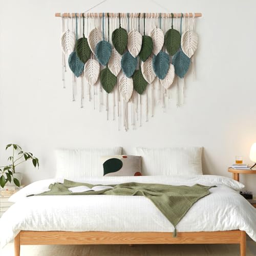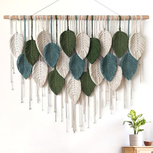 ASTNIC - بساط تعليق جداري من المكرمية بتصميم ورقة شجر، نسيج بوهيمي كبير منسوج يدويًا بشراشيب، ديكورات منزلية فنية أنيقة لغرفة النوم وغرفة المعيشة والحضانة من استنيك، 99 سم × 75 سم (عرض×طول)