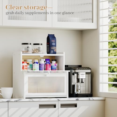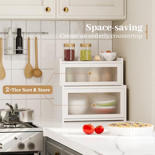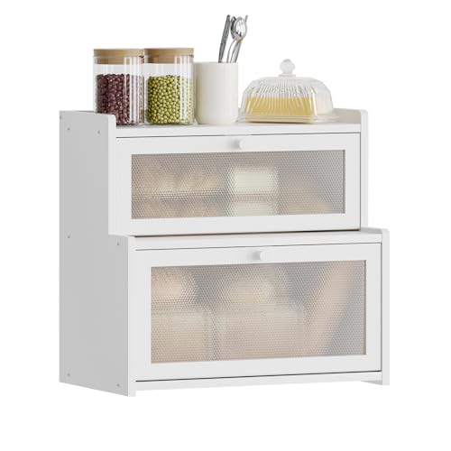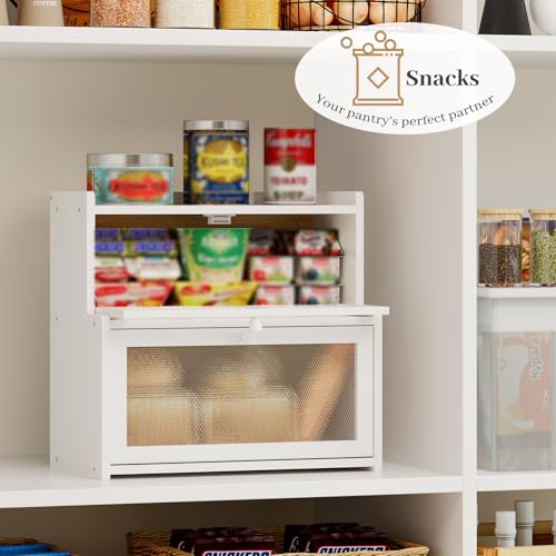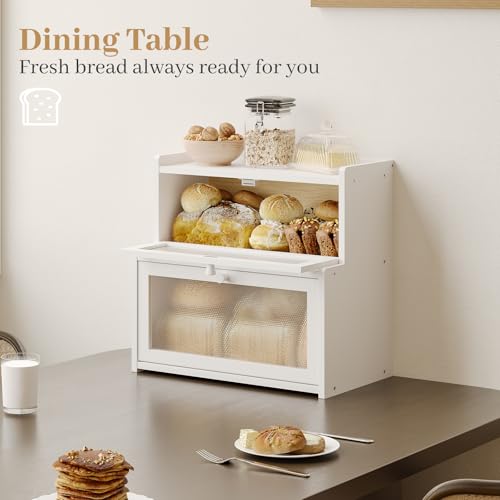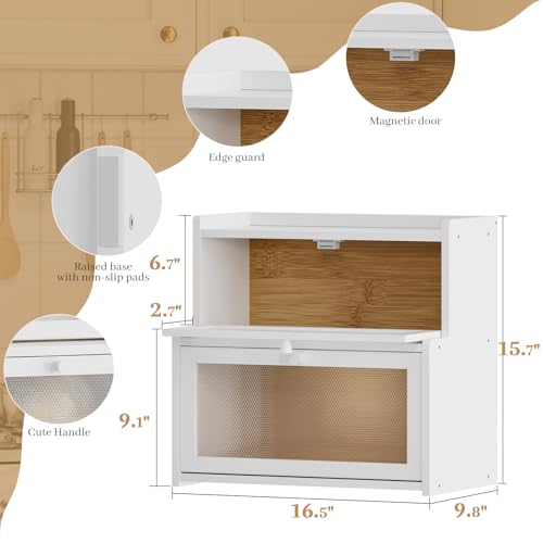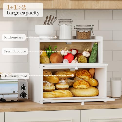 AUGOHCMIL - Bread Box for Kitchen Countertop, Large Bamboo Bread Storage Container with Double Layer, Bread Holder for Homemade Bread, Farmhouse Corner Organizer for Pantry (White)