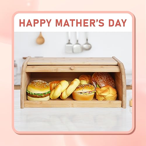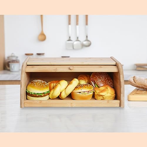 - 🍪【Premium Natural Bamboo Material】Crafted with natural bamboo, our bamboo bread bin for kitchen counter will add classic atmosphere to your kitchen décor while keeping your bread, cake, pastries, donuts, baguettes and other baked goods fresh.