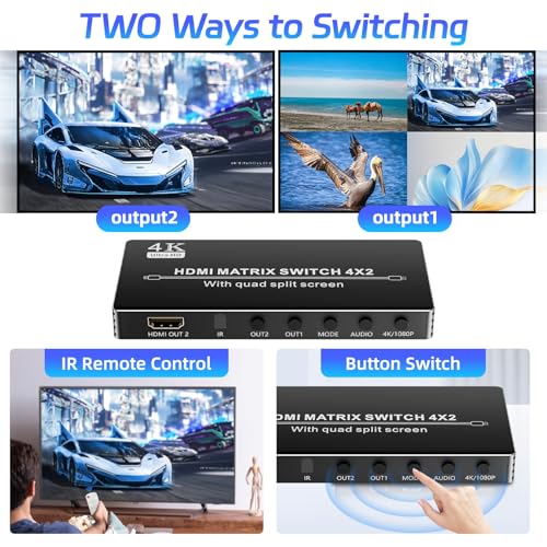 BolAAzuL - محول ماتريكس HDMI 4X2 مع عرض متعدد رباعي مزدوج 4K بـ 4 في 2 مخرج متعدد العرض من بولازول