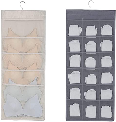- SIZE: Dual sides 6+18 Pockets:large & deep pockets for books ,shoes or bra organizer, keep your bra in shape. The other pockets are bigger enoughto hold your socks,makeup,Jewelry, scarves,cosmetics accessories. See-through mesh pockets design helps you to find youritems quickly and easily and saving your time.Increase capacity, meet your morestorage needs.