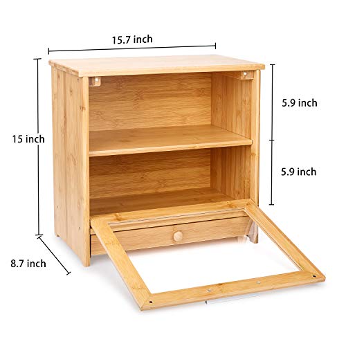 - DIMENTION: L:15.7”x W:15” x H:8.7”, take small kitchen space and brings you twice capacity. And this nature bamboo bread box is suitable for large families of 4-6 people.