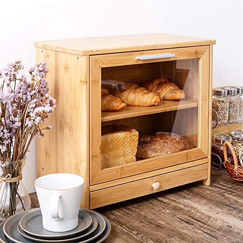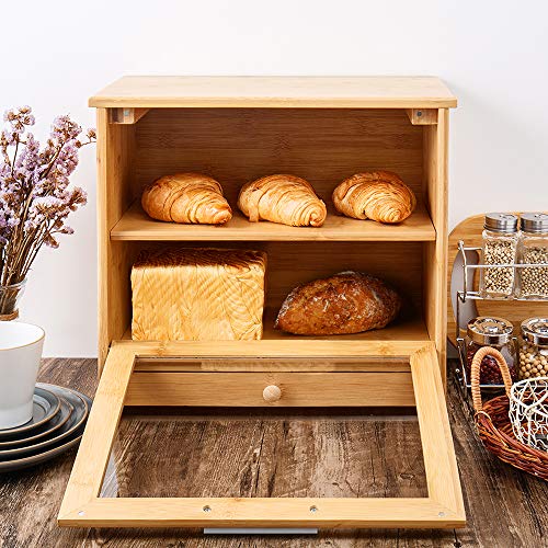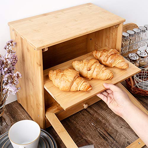 - MULTI-FUNCTIONAL DESIGN: 2-Layer Design, a bamboo partition makes the bread box 2 floors, which will avoid effectively deformation of bread caused by extrusion. Removable layer can use for cutting bread.