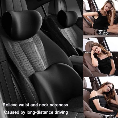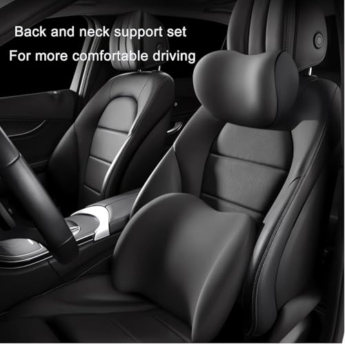 Htselere - وسادة دعم اسفل الظهر للسيارة ووسادة رقبة للسيارة، مسند راس مريح لمقعد السيارة ووسادة قطنية مع حزام قابل للتعديل لتخفيف الام الرقبة والظهر، لكرسي المكتب والشاحنة والكرسي المتحرك (اسود)