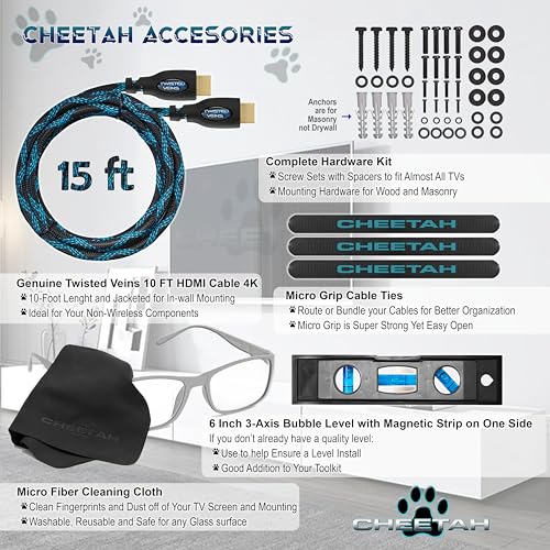 - Includes a Twisted Veins 15' HDMI cable, 6" 3-axis Magnetic Bubble Level, Microfiber Cleaning Cloth, and Full Hardware Kit