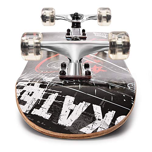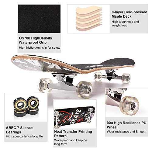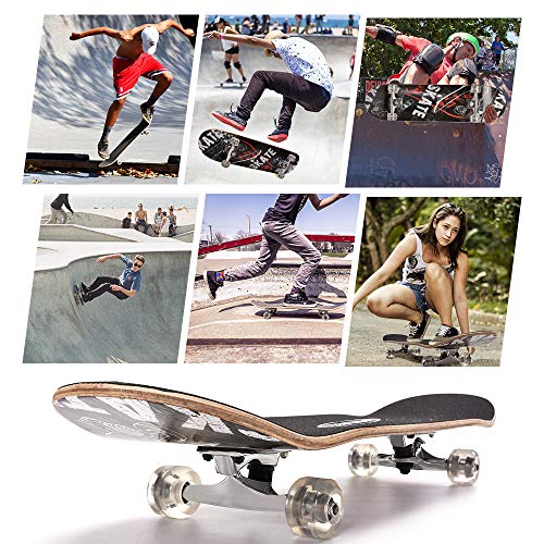- Durable & Stable - High density 8 layer maple wood skateboard with emery non-slip surface provides a stable and more powerful grip during skating; Max supporting weight 220 lbs(100KG), suitable for adults and kids.