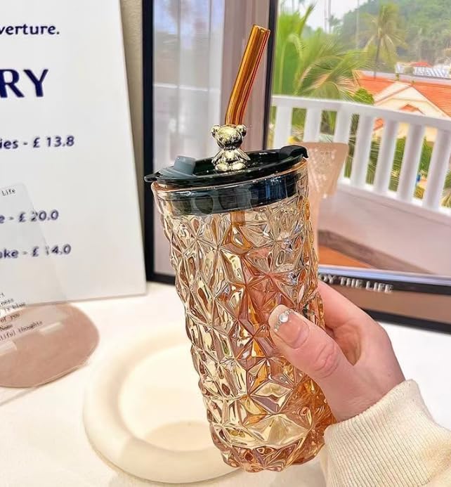 Circle M - كوب زجاجي كريستالي مزخرف من سيركل ام سعة 500 مل مع غطاء ماصة ودب: نمط ماسي - كهرماني