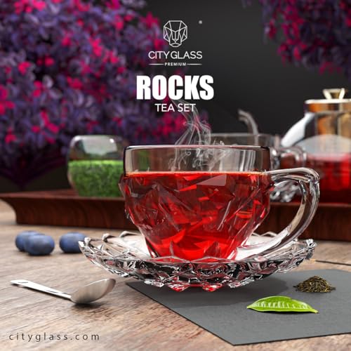 Generic - City Glass Rocks Tea Mug Set | Tea Mug Set of 6 Mugs + 6 Serving Plates | Decorative Wall Tea Cup Set Comes with Decorative Serving Plate (Tea 210 ml)