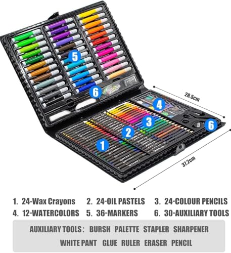- All-inclusive art kit contains 150 pieces of drawing and painting tools.