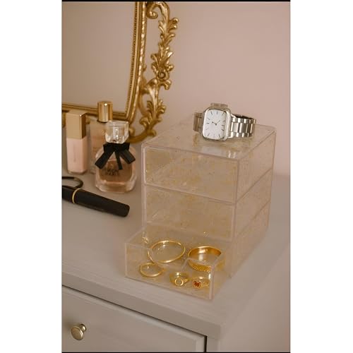 - This three-drawer organizer features a sleek, minimalist design that elegantly displays makeup and accessories while maximizing space efficiency in any vanity or bathroom setting.