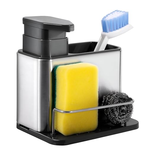 - This 3-in-1 soap dispenser and kitchen sink organizer combines a stainless steel soap pump with a storage compartment, making it perfect for both kitchen and bathroom use. It streamlines your cleaning essentials all in one sleek housing.