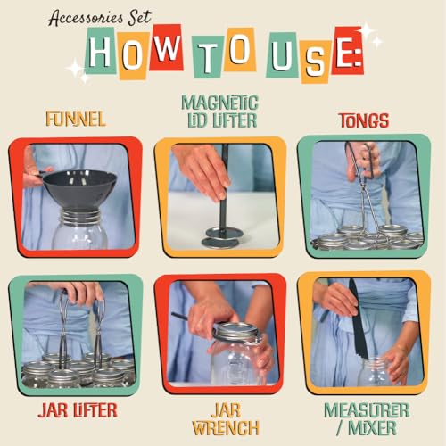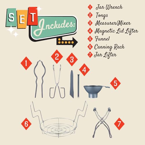 - Set Includes: Tongs (vinyl coated), Jar lifter (vinyl coated), Jar Wrench (vinyl coated), Funnel, Magnetic lid lifter, mixer/ measurer, and a stainless steel 12.25" rack