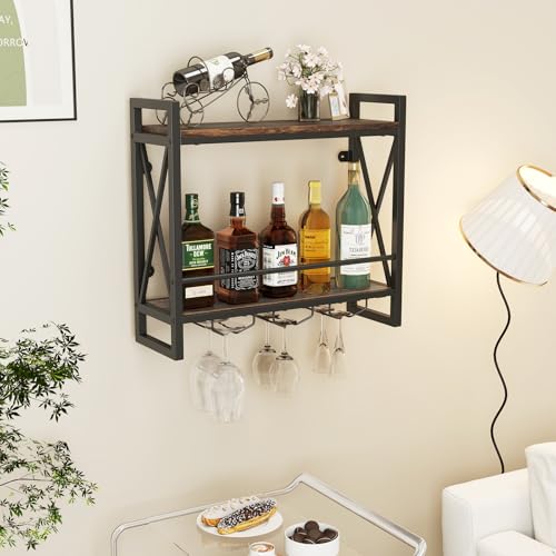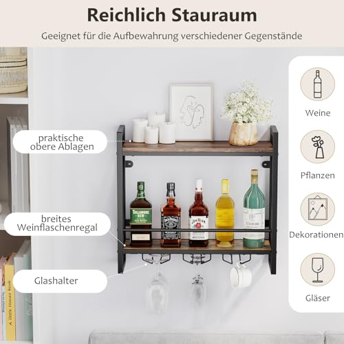 - مساحة تخزين كبيرة: يتميز رف النبيذ المثبت على الحائط برف علوي عملي وحامل زجاجة نبيذ عريض يوفر مساحة واسعة لتخزين زجاجات النبيذ والنباتات والديكورات والمزيد. بالإضافة إلى ذلك، يمكن لحامل الأكواب متعدد الوظائف حمل كل من الأكواب وكؤوس النبيذ.