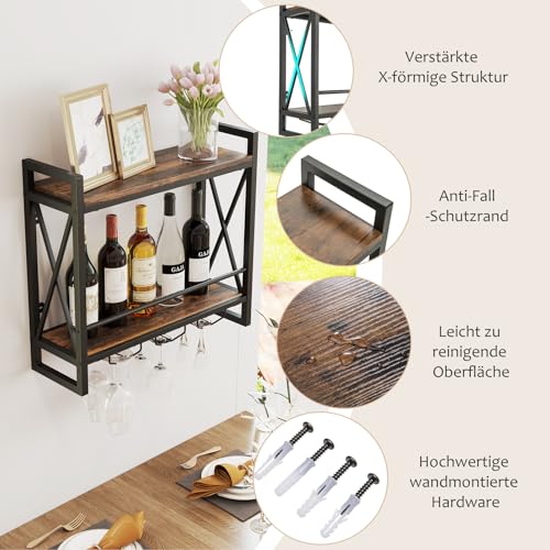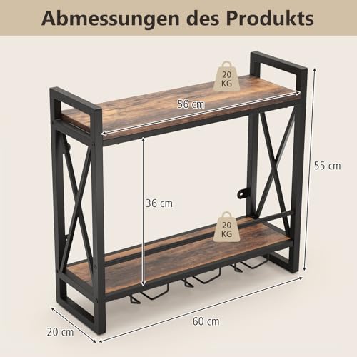 COSTWAY - كوستواي رف زجاجات مشروبات من طبقتين من الخشب باطار معدني مع 3 صفوف من حامل اكواب النبيذ، تصميم صناعي، مثالي للمنزل والبار والمطبخ والمطعم مقاس 60 × 20 × 55 سم