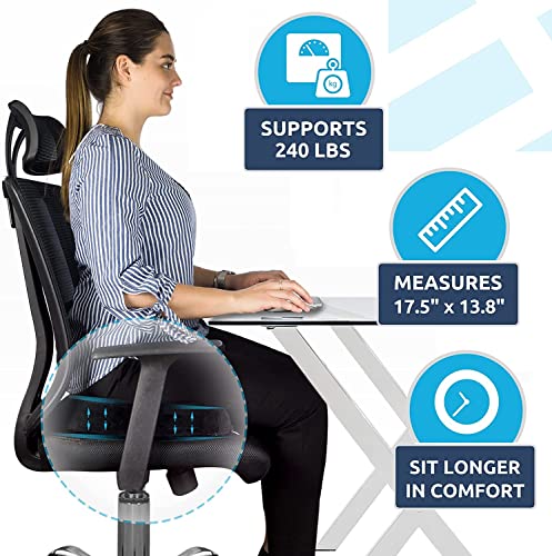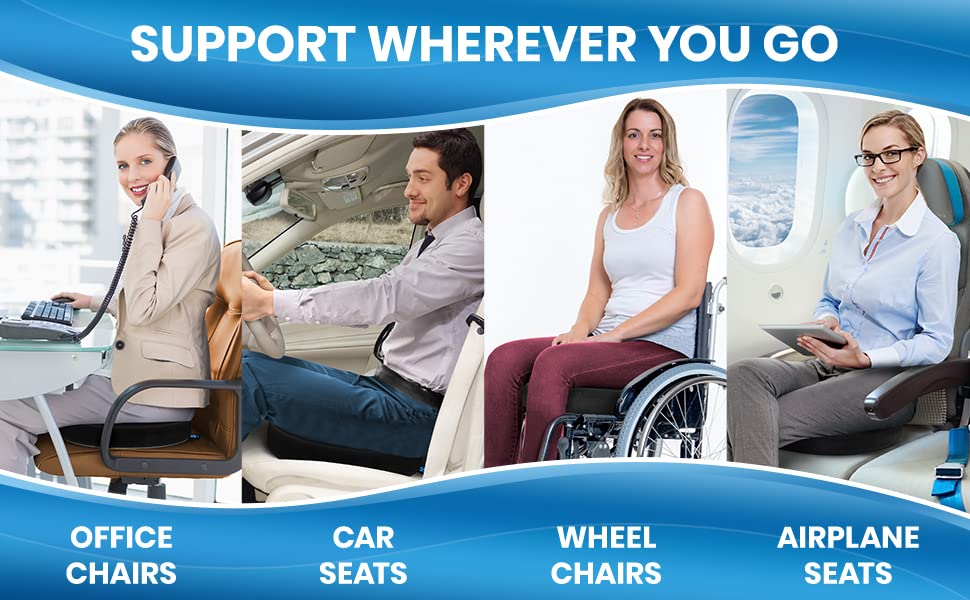 - وسادة المقعد المريحة مصممة بشكل علمي لاحتضان الفخذين والوركين وتساعدك على الجلوس بشكل مستقيم على أي كرسي.
