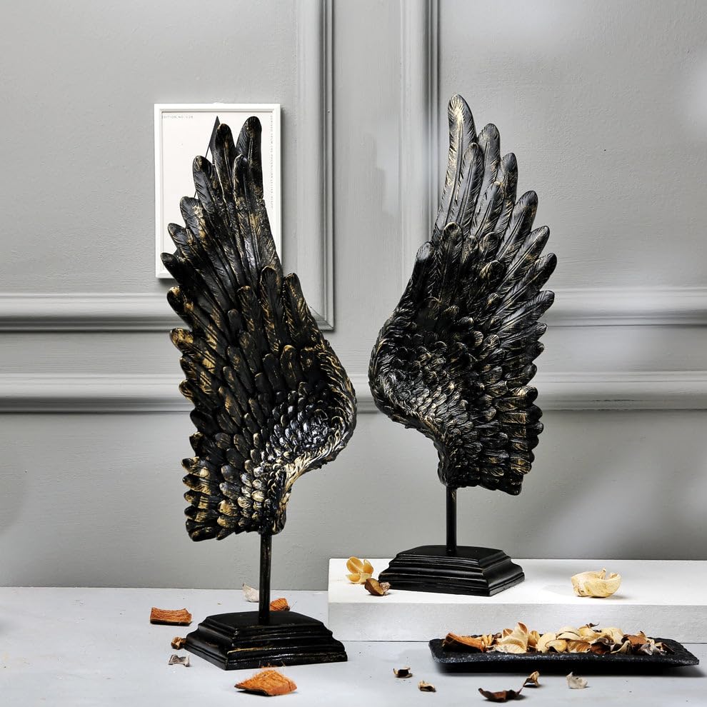 • DESIGN: Elegant pair of angel wing sculptures featuring a striking black finish with gold accents, perfect for sophisticated home décor