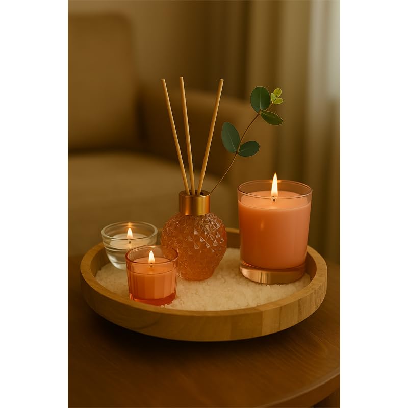- إضاءة محيطية: ثلاث شموع معطرة فاخرة في حوامل زجاجية شفافة وملونة باللون المرجاني تخلق جوًا دافئًا ومريحًا