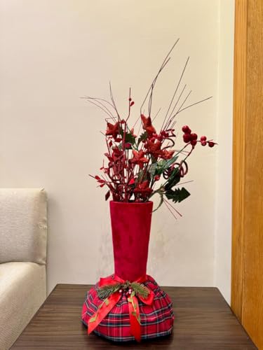 Generic - Decorative Holiday Red Vase with Artificial Berries, Plaid Base Wrap, Christmas Theme Floral Arrangement, Winter Home Decor
