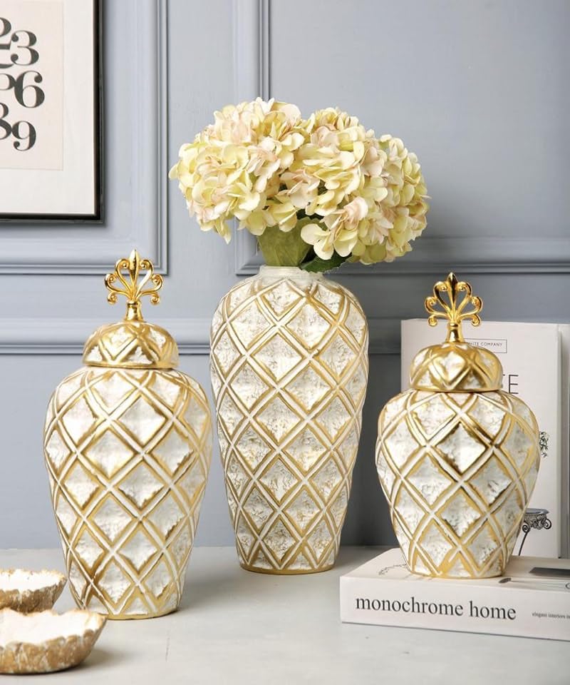 Generic - Decorative Mercury Glass Ginger Jars with Gold Pattern, Set of 3, Luxury Vases with Crown Lids