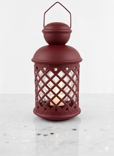 Decorative Metal Lantern with Mesh Design, Burgundy Red, Top Handle, Ambient Lighting