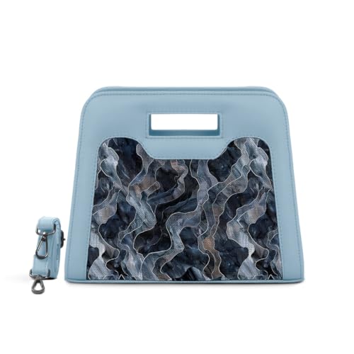 Generic - شنطة يد مصممة بنمط الوان مائية، حافة جلدية بلون ازرق فاتح، طباعة كحلي داكن