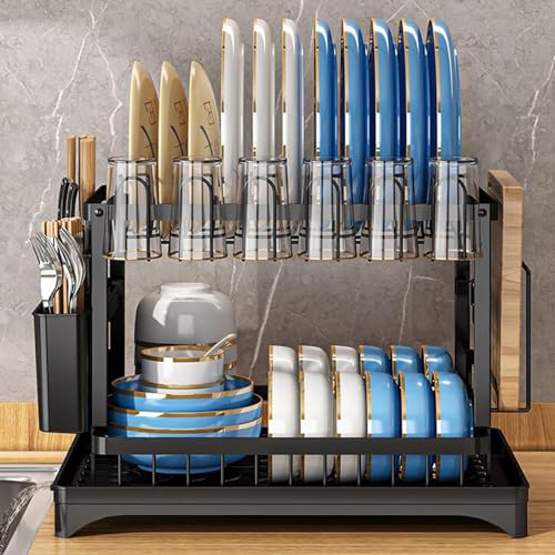 Qshare - Dish Drying Rack,2 Tier Drying Rack Kitchen with Drainboard,Large Capacity Dish Drainer Organizer Shelf with Utensil Holder, Cup Rack for Kitchen Counter (Black)